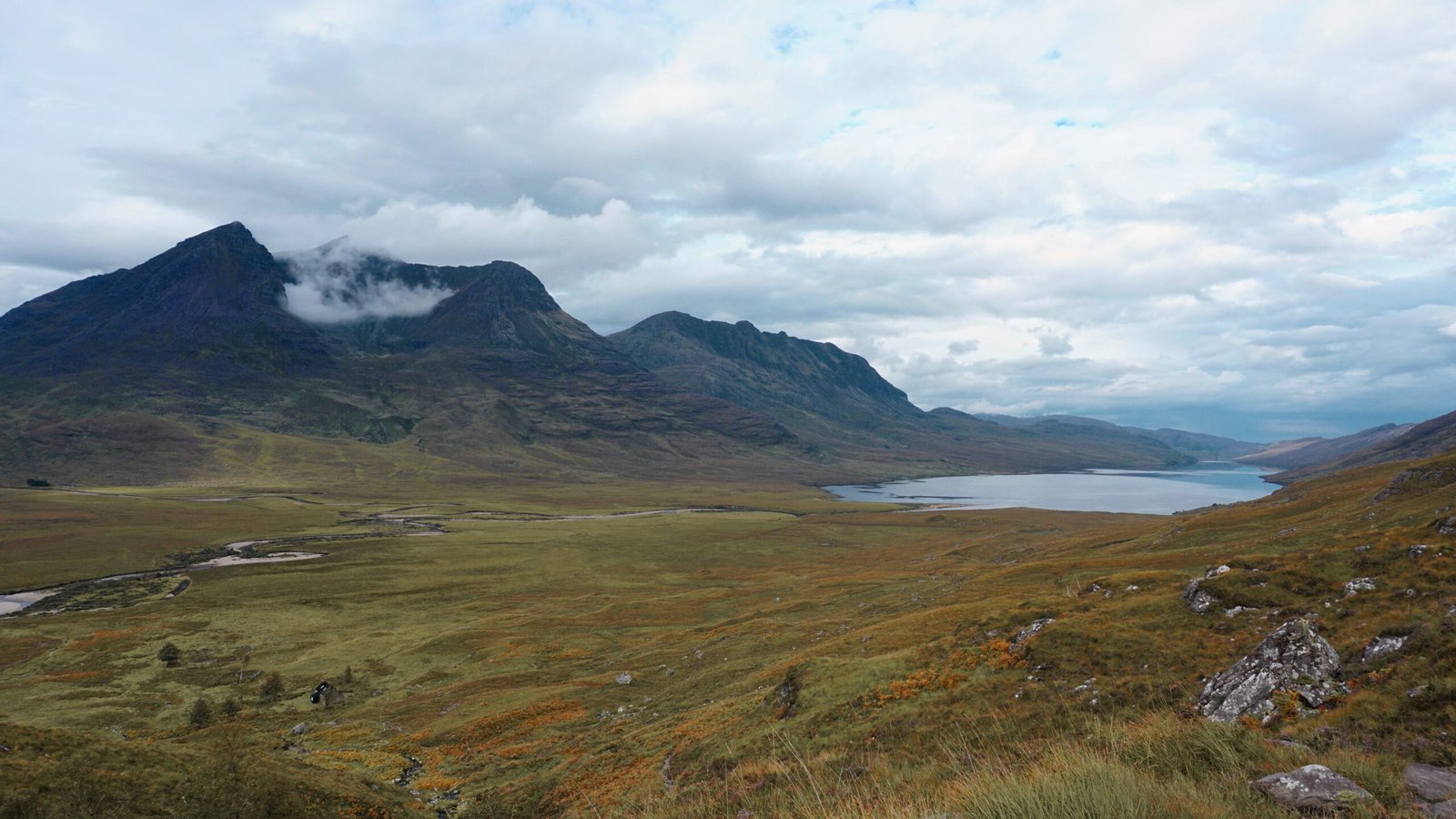 While continuing uphill, I heard my carrier lady becoming sadder with every step she took. She loved this place! She had dreamt of camping here since they had passed by three years ago. She had dreamt of drinking tea at the side of the lochan and of opening up her tent in the morning to look over the rippling water and the vast mountain surroundings. Not this time. No. Instead it was an uphill battle with torrential rain and blasting winds. Tears running down her cheeks were washed away. We kept going. While the sky cleared, we made our way across pathless, boggy terrain following heaps of stones placed along the way by caring hikers who had passed before us. Through a surprisingly deep little river and into the valley towards another river crossing. Along Loch an Nid towards a short section of 4×4 and a clear path for the last four kilometres of the day. The clouds were hanging low and night was falling. My carrier lady somehow found another burst of energy and started to shoot along the path. Waving her walking poles alongside her, she kind of looked like a madwoman. She wanted to get there before the next shower started pouring down. Alas, she did not succeed. For the third time that day the skies opened up. Rain poured down as if to remove all human traces from this remote place and give it back to nature in all its beauty. Once again completely soaked, they reached the bothy. What a place! For a bothy it’s an enormous building. Yet, between the rugged peaks surrounding it, it’s a mere little speck. What a day! So much wilderness it makes you want to hold your breath, simply not to disturb the splendour. Sometimes it is hard to believe that so much beauty still exists, despite the efforts of so many to destroy it. Maybe it is as Richard E. Byrd wrote in his book ‘Alone’:
